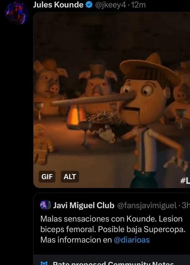 - 2025-12-22记者称孔德受伤将缺战西超杯,球员社媒发匹诺曹表情回应