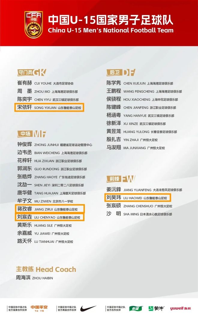 泰山青训4人入选U15国足集训名单